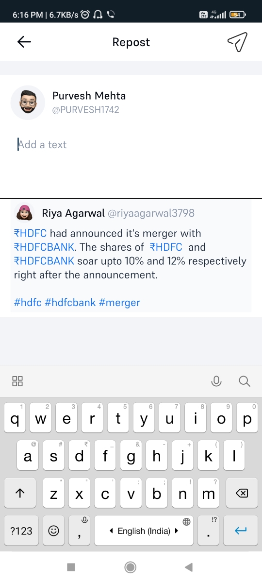 Tap on the plus icon & type ₹(rupee symbol) followed by the stock name, then you can add the stocks that you want to talk about in your posts.