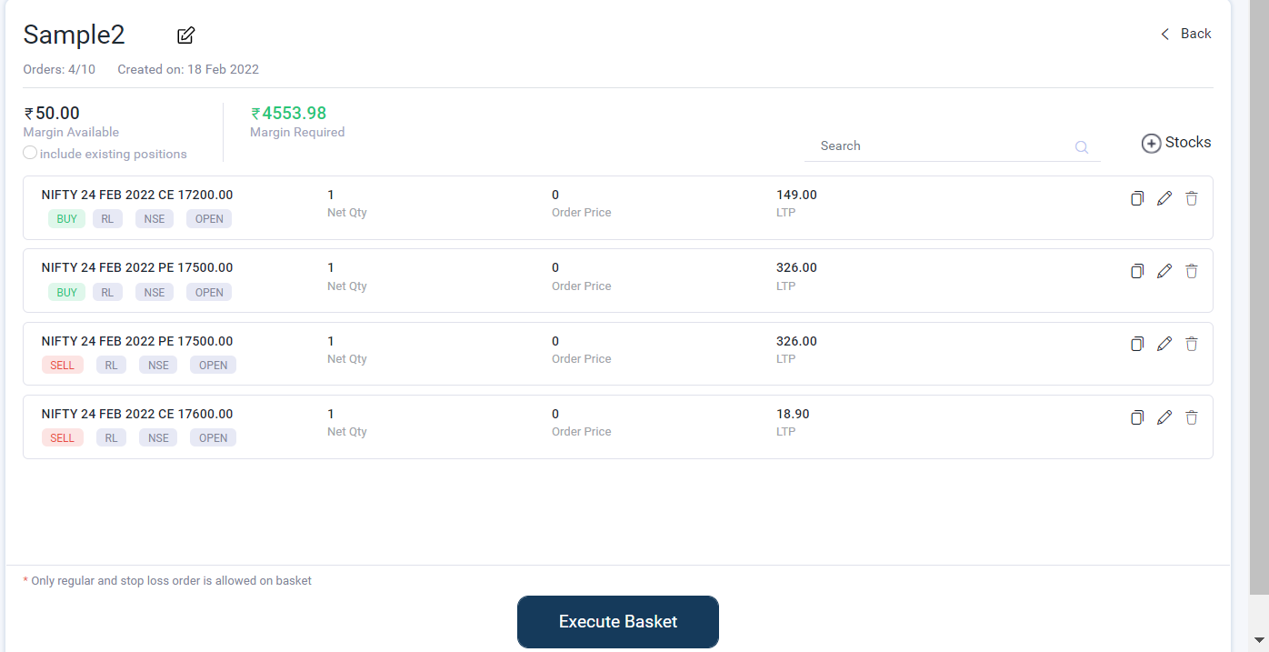 There are Multi-legged strategies that you can implement with the help of the Basket Order such as: