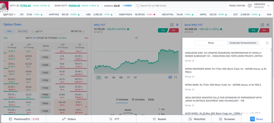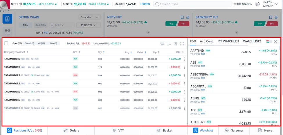 - Position book and Watchlist: The position book in your portal has been completely redesigned so that users can easily understand the current position of all his/her trades. We have also revamped the thought process of the watchlist. Now we have a default watchlist which includes all the FnO stocks.