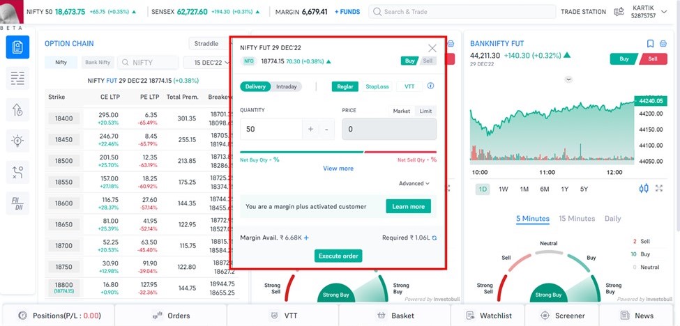- Straddle- Straddle is the most preferred and easiest trading strategy that many traders opt for. Here on the option chain in F&O 360 web, we’ve given the whole strategy where you can execute the order with just a click.