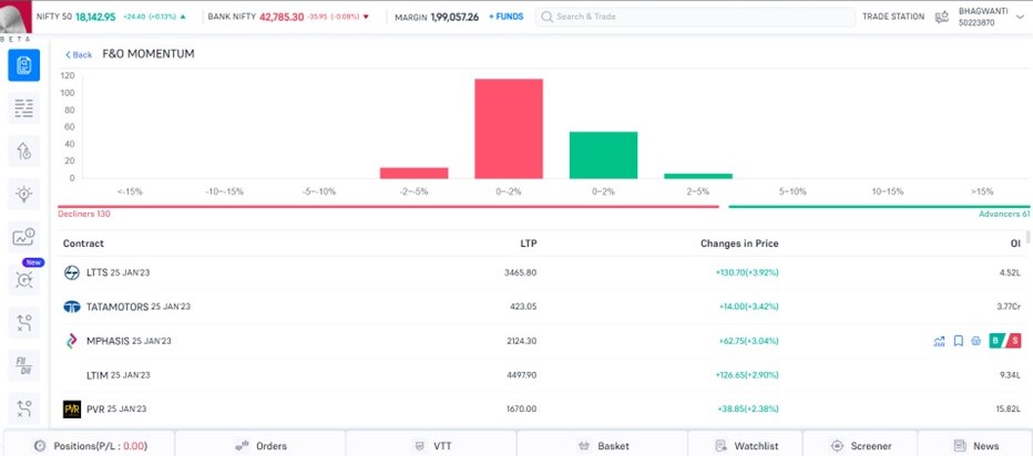 - F&O Momentum: It offers a visual representation of the live market momentum. With this feature, you can see how many stocks under the F&O segment are trading in positive and negative and in what range.