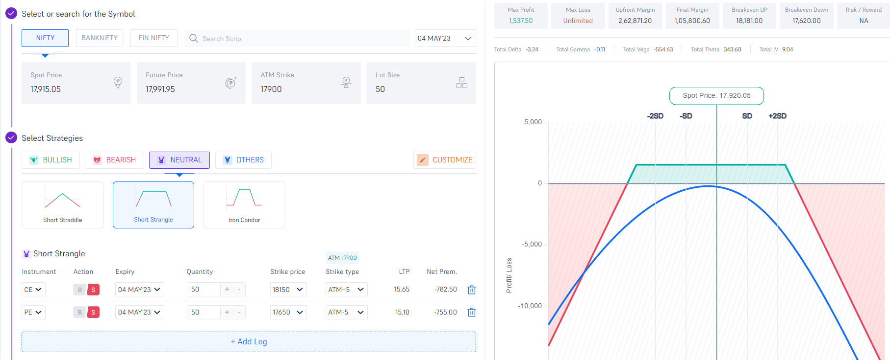 Not only do the Smart Strategies in options executes the strategy, but it also gives a brief about it, like you can check the Payoff Graphs, Futures Chart, Greeks, and P&L, including the position summary such as Margin requirements, breakeven ranges, premium to be received, etc. as shown in the below image-